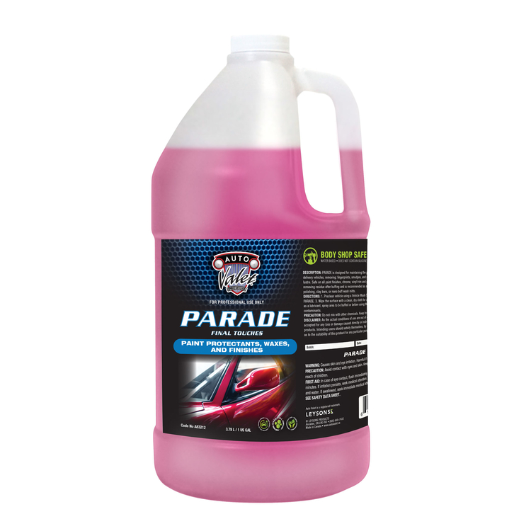PARADE is designed for maintaining the perfect finish on display or final delivery vehicles, removing: fingerprints, smudges, and surface dust while enhancing lustre. Safe on all paint finishes, chrome, vinyl trim and glass. PARADE is ideal for removing residue after buffing and is recommended as a lubricant for compounding, polishing, clay bars, or nano buff wash mitts.