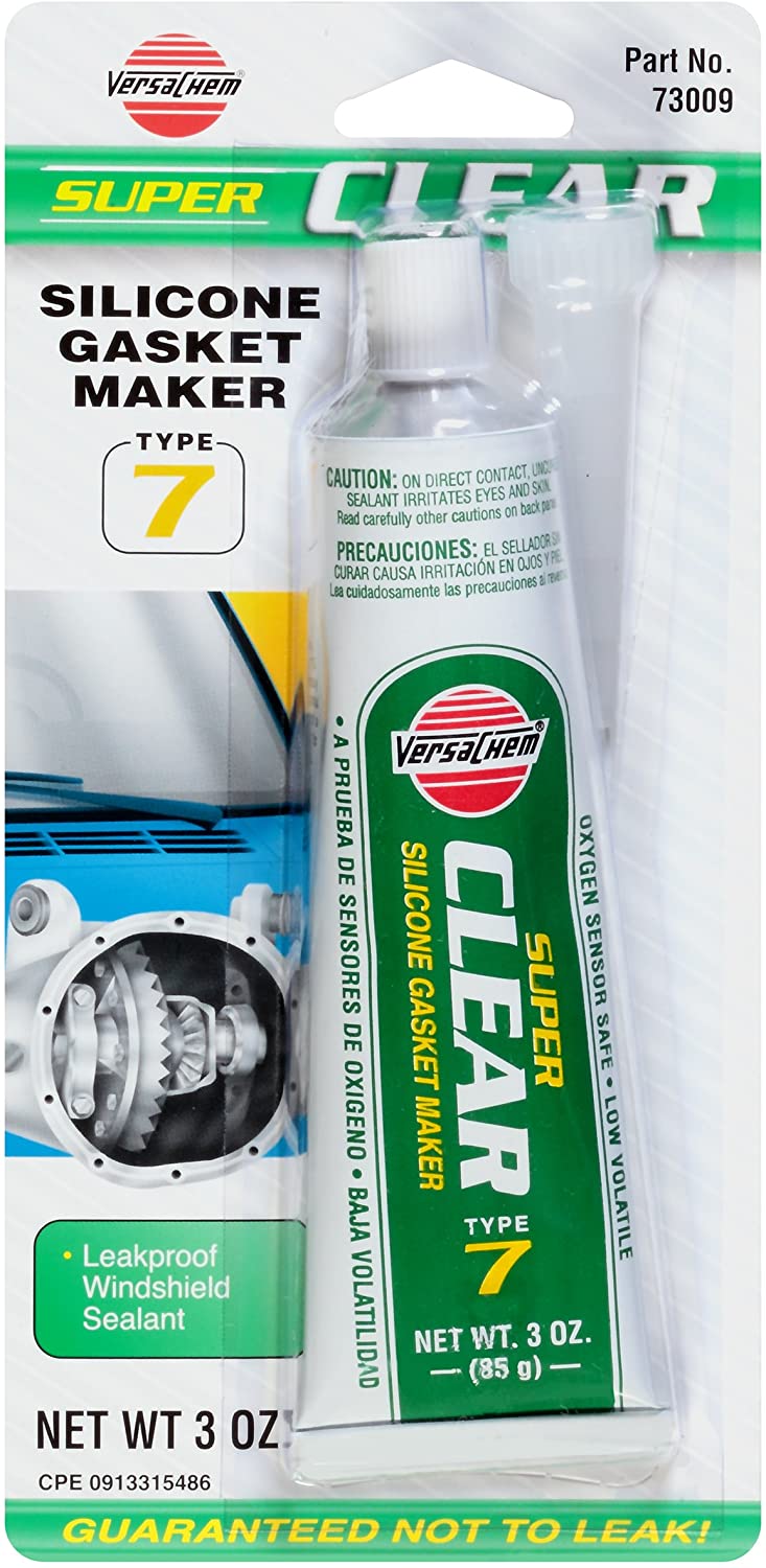 Clear silicone that replaces felt, paper, rubber, asbestos, and cork gaskets. Seals windshields, lights, rubber hose connections and insulates wiring. Bonds glass, plastic, metal, leather, concrete, fabric, etc. Easy to use. Liquid Resistance: oil, transmission fluid, antifreeze, diesel fuel, lubricants, water, steam, etc.